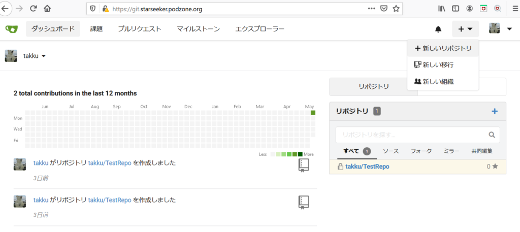 Giteaにログイン後、右上の+マークから”新しいリポジトリ”をクリック。