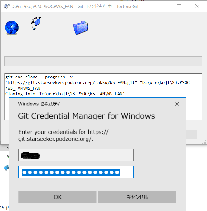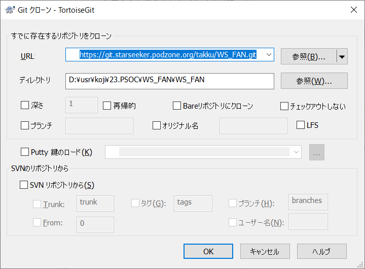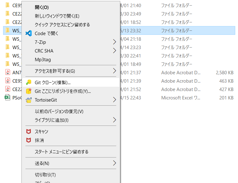 Gitリポジトリを扱うフォルダを右クリック -> Gitクローン(複製)を実行
