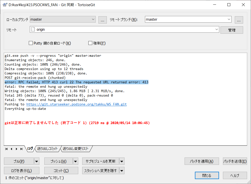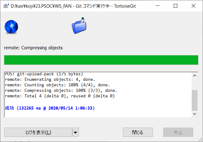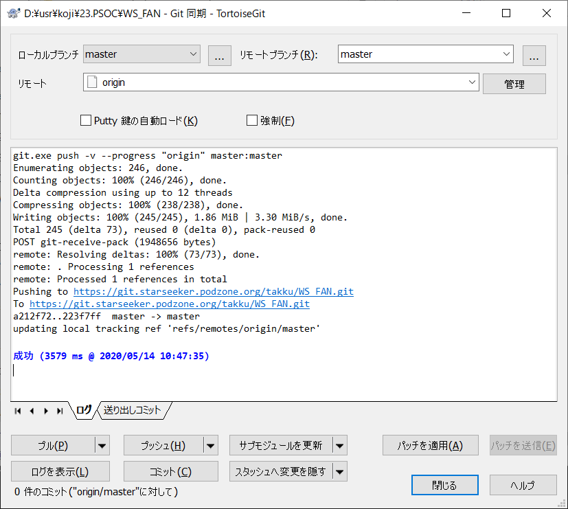 Gitフォルダを右クリック -> Git同期を開き、”プッシュ”実行するのだが、