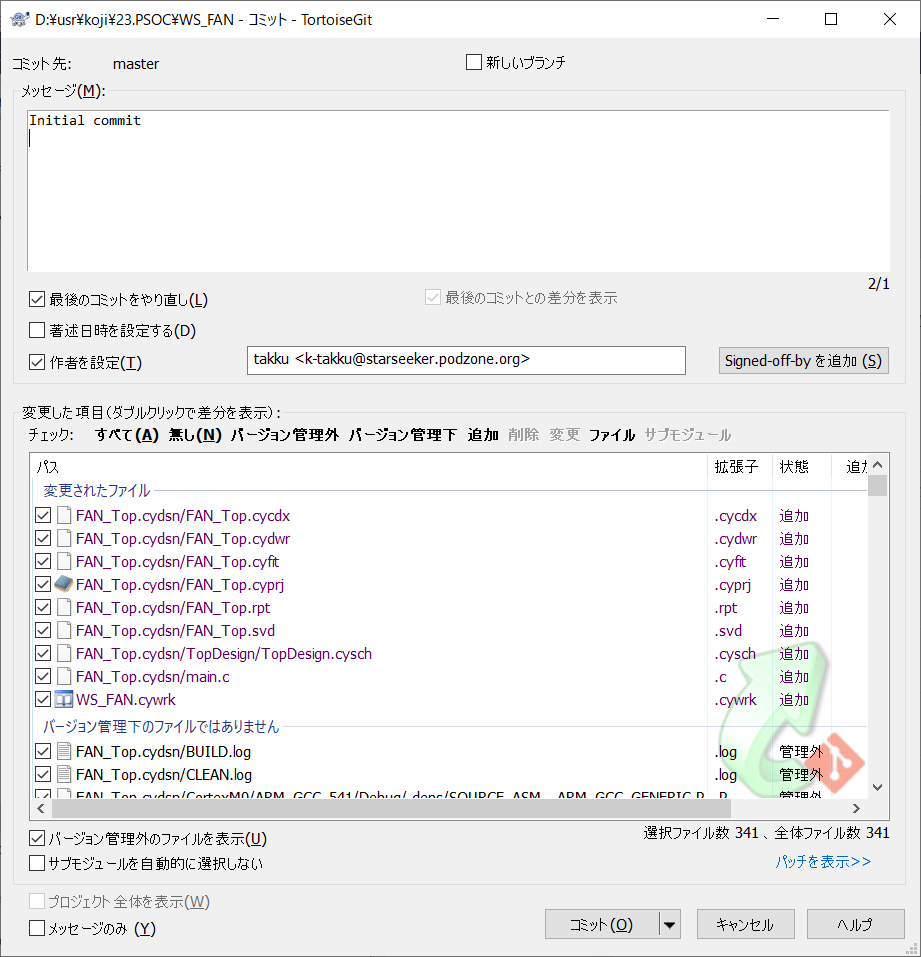 gitフォルダを右クリック -> Gitコミットすると以下の画面が表示されるので
