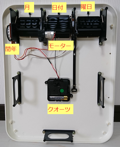 クオーツから線を引っ張ってきて、紆余曲折しながらモーターに接続されてる。それとは別に、クオーツから歯車を経由して曜日めくりギミックを動かすようになってる。