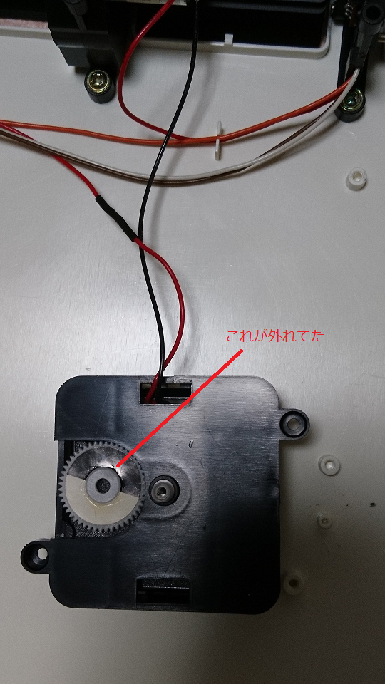 裏返すと以下のように、クォーツの芯とメカギミックを繋ぐ歯車が外れてた。