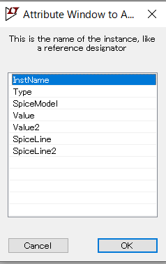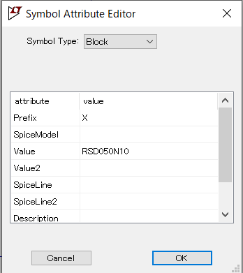 Value : .libファイルのSUBCKTの行にあるモデル名を記載