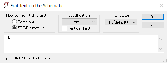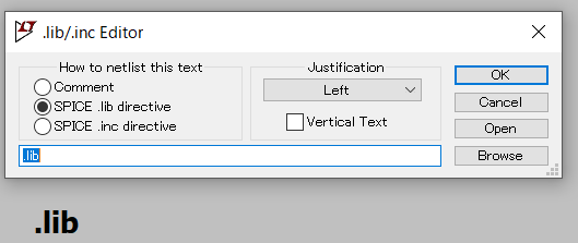 SPICE directiveを選択して、”.lib”とのみ入力