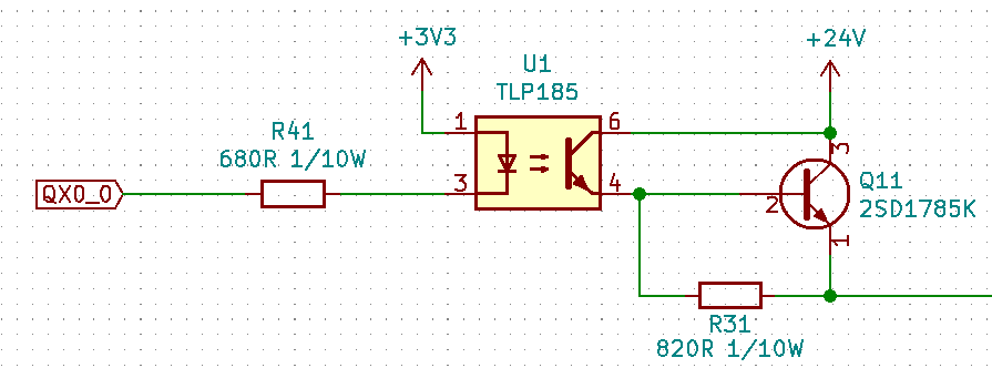 ラズパイの3.3V IOから、フォトカプラを挟んでNPNトランジスタのエミッタフォロア出力で24Vを出力するようにする。
