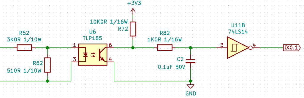 相手側の24V出力をフォトカプラで受けて、ラズパイの3.3V IOに接続する。