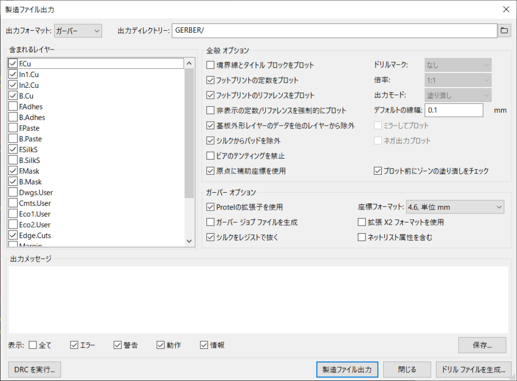 ファイル -> プロットから、以下の設定で”製造ファイル出力”を実行。