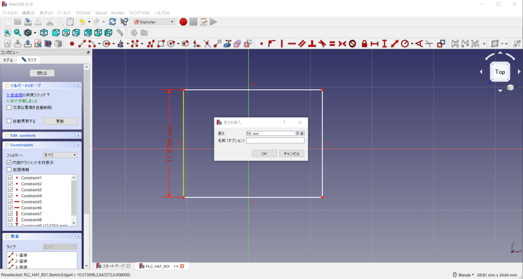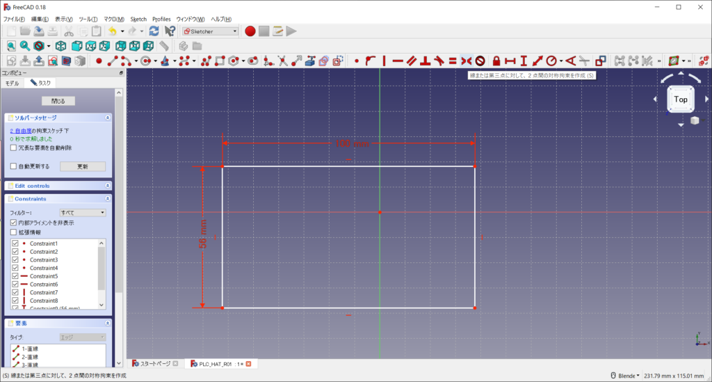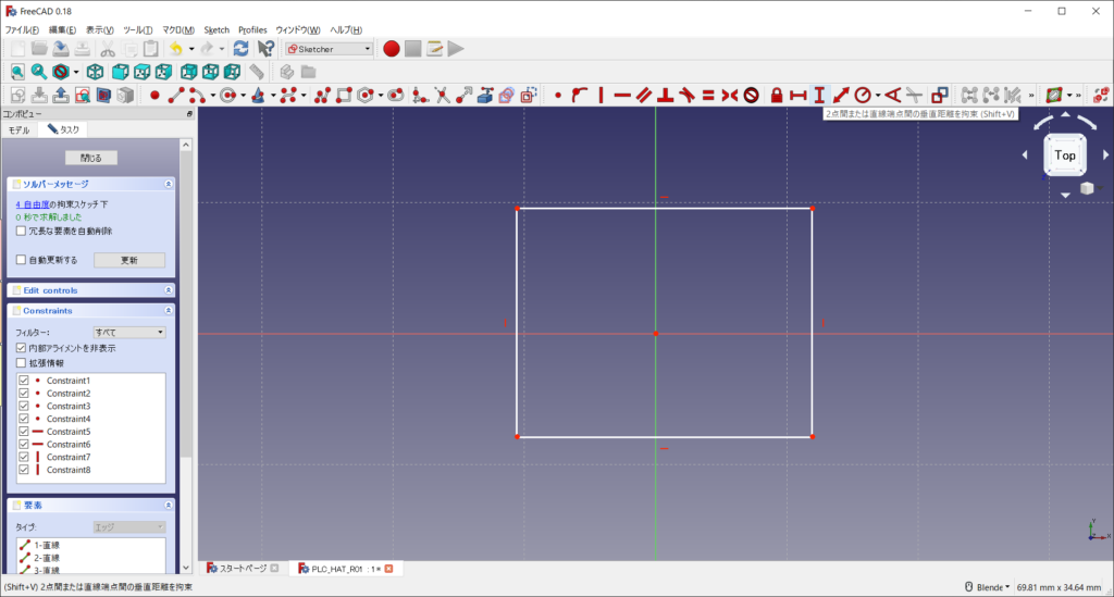 四角枠を作ったら、”垂直距離の拘束”ボタンをクリック