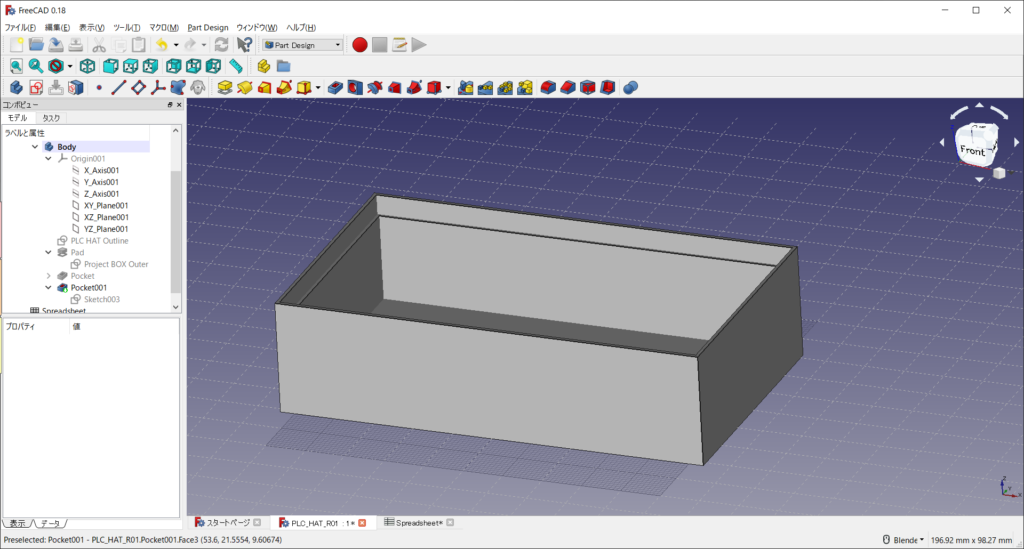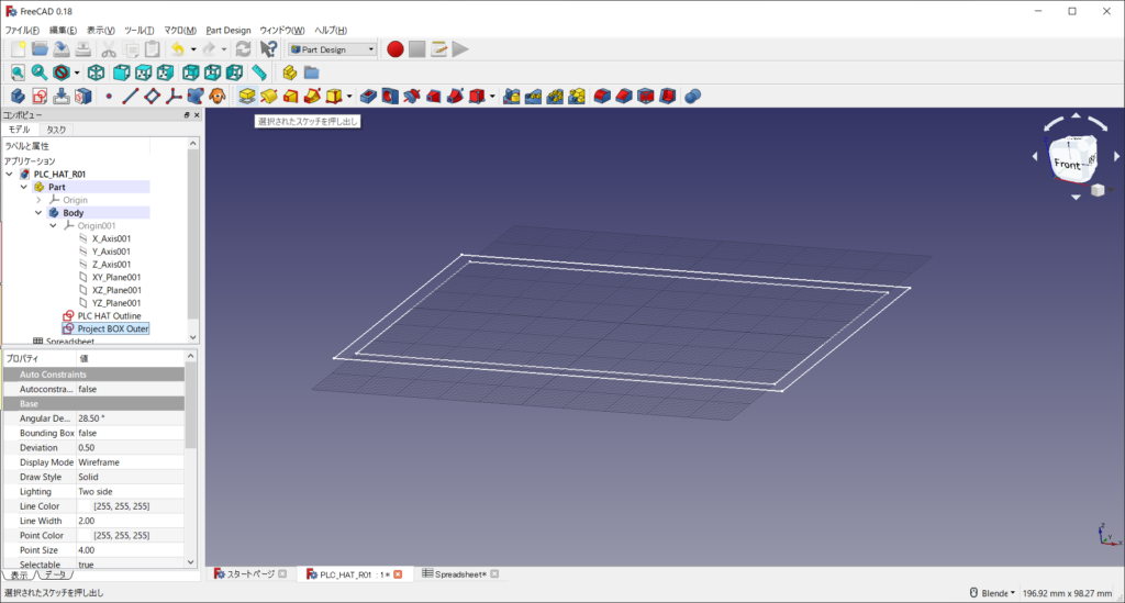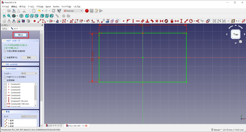 タスクを閉じて、Sketch001を”Project BOX Outer”に名前変更しておく。