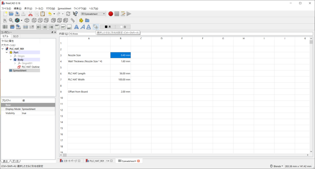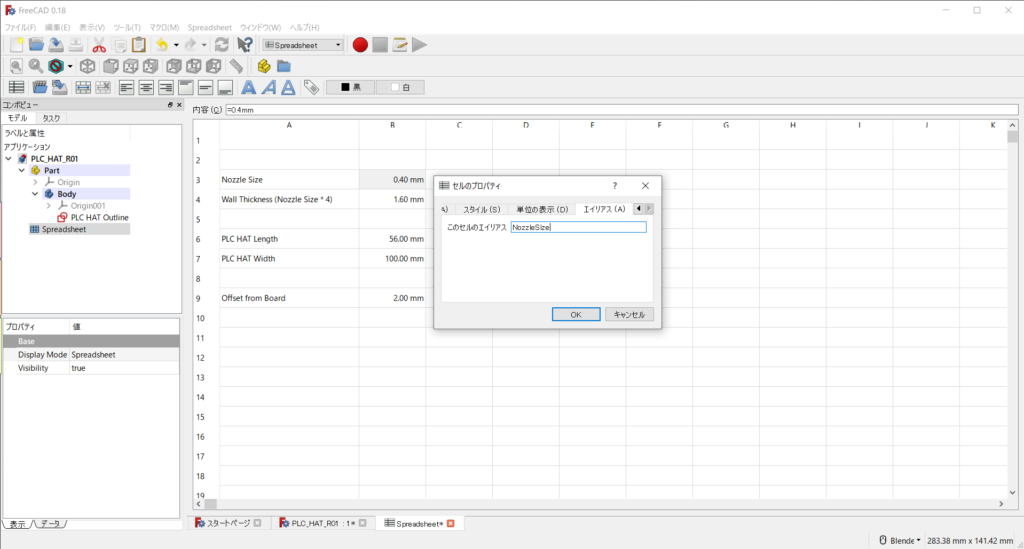 FreeCADではmmとmilを明確に区別するので、セルには”0.4mm”などを入力する。
