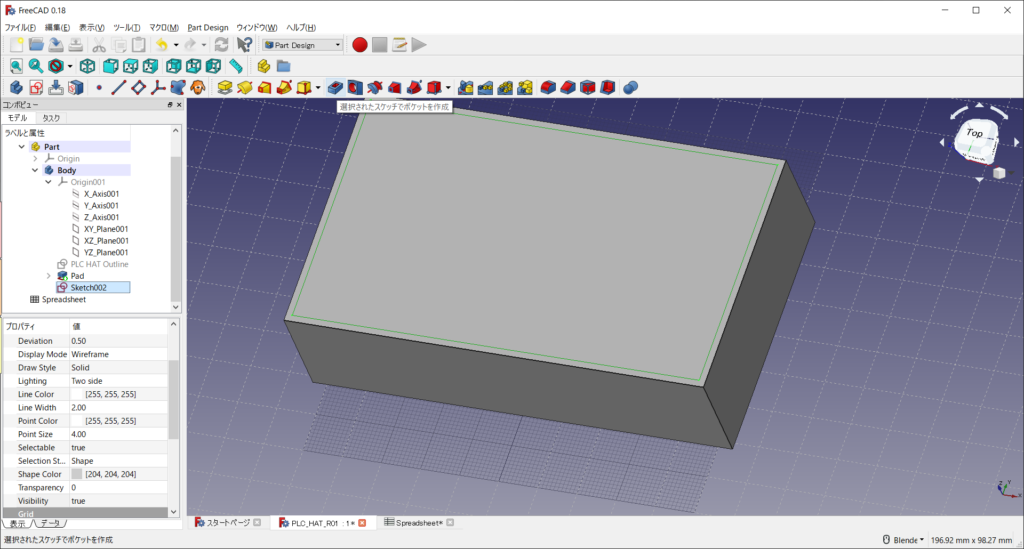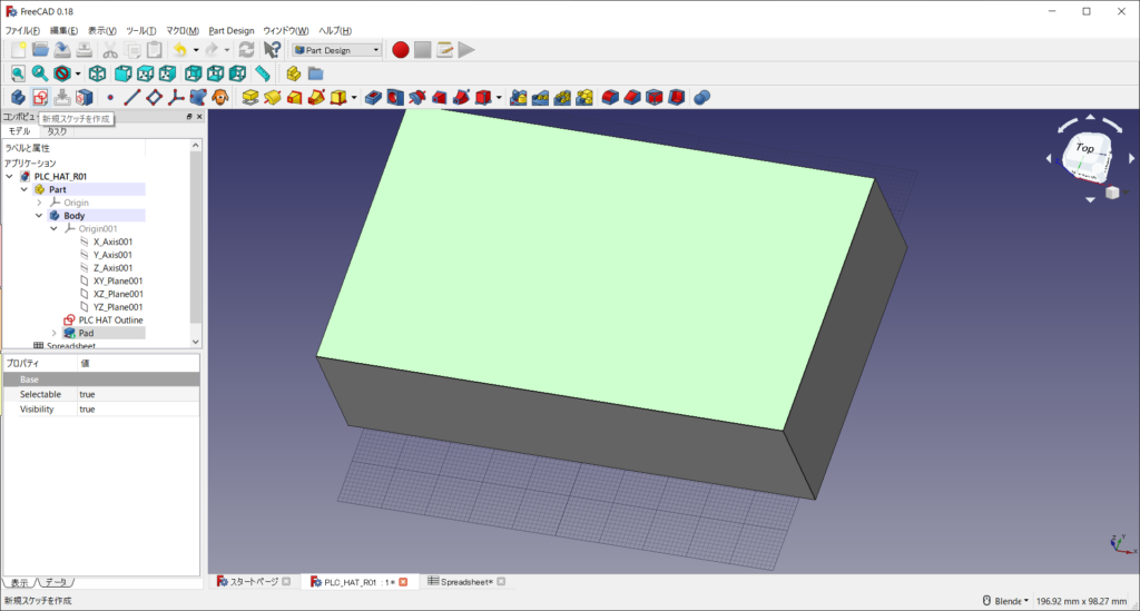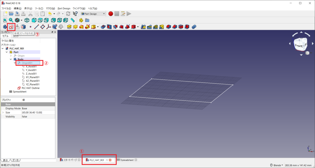 Part->Body->Origin001をクリックしてアクティブにした状態で、