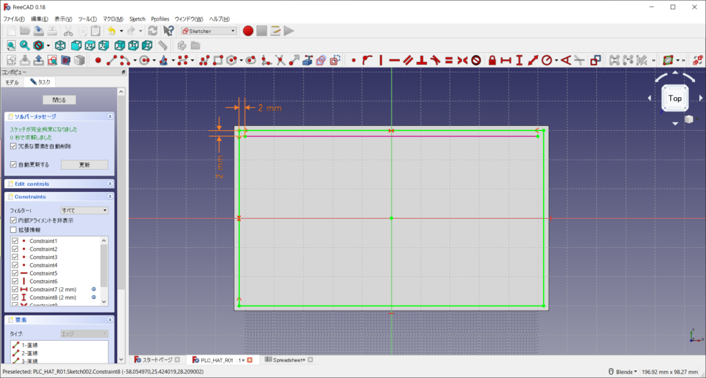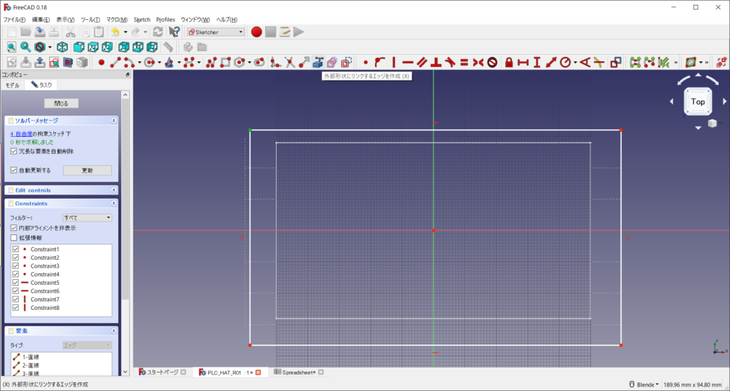 “外部形状にリンクするエッジを作成”と垂直・水平距離拘束で、
