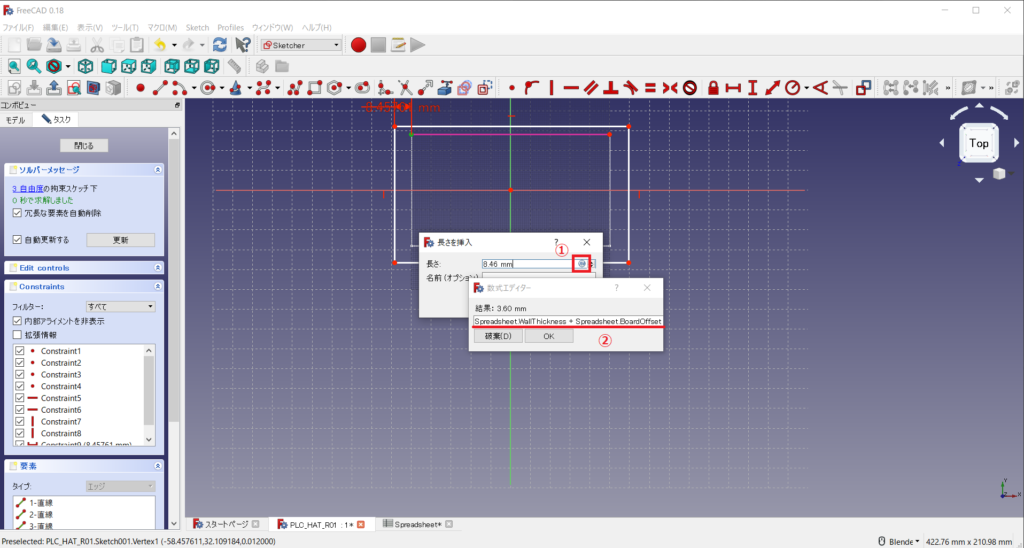 今度は、PLC HAT Outlineに対して”Spreadsheet.WallThickness / 2 + Spreadsheet.BoardOffset”で四角枠を作成する。