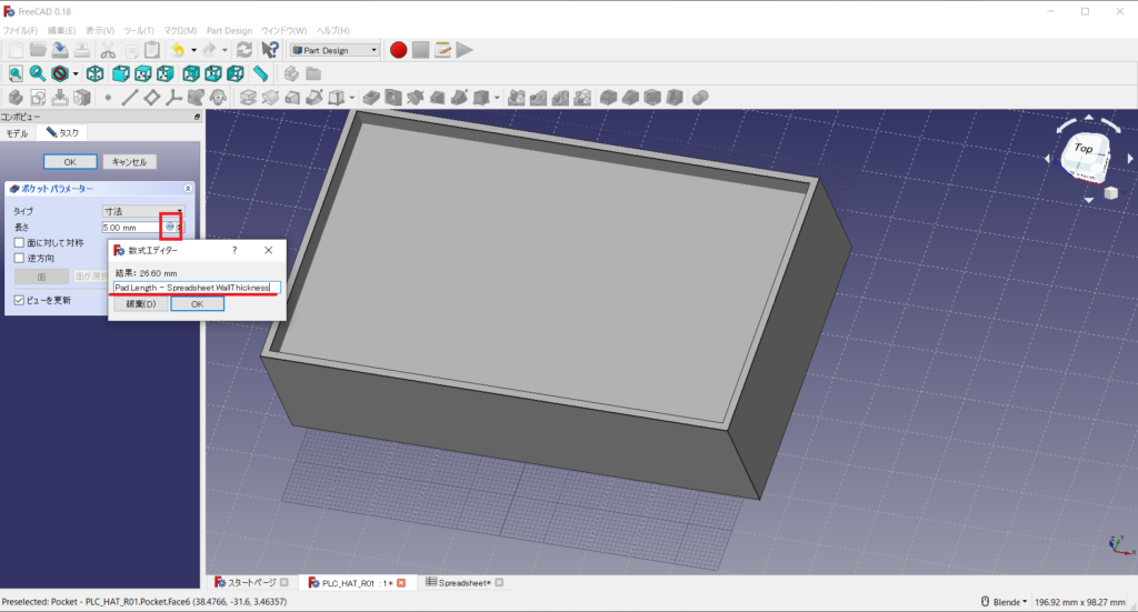 穴の深さは、数式エディターで”Pad.Length – Spreadsheet.WallThickness”を設定。