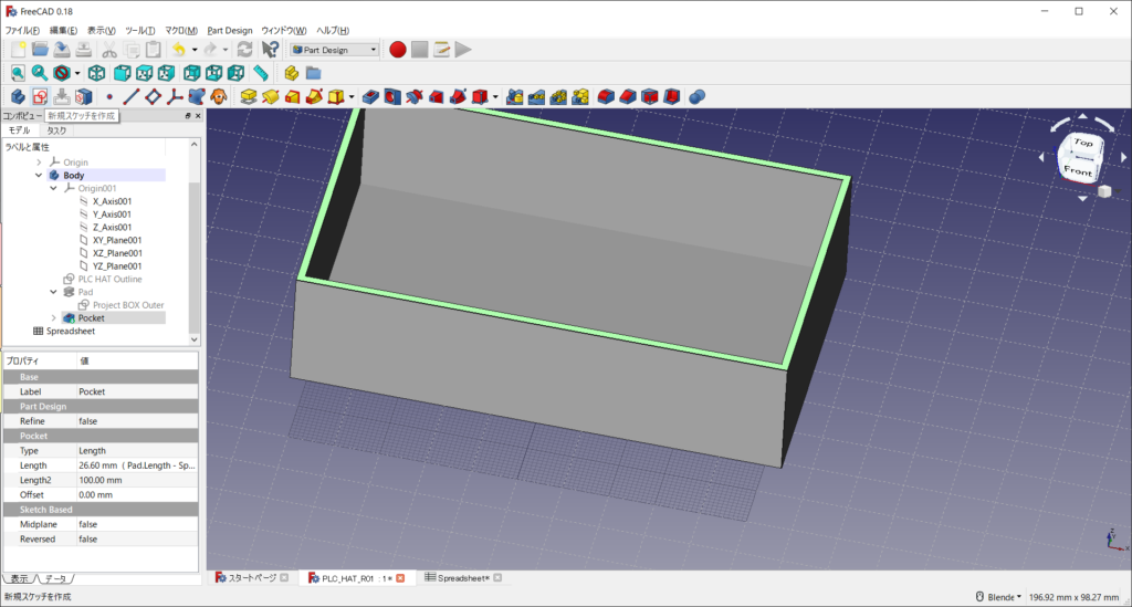 箱の底面をクリックして(緑色フォーカス)、新規スケッチを作成。