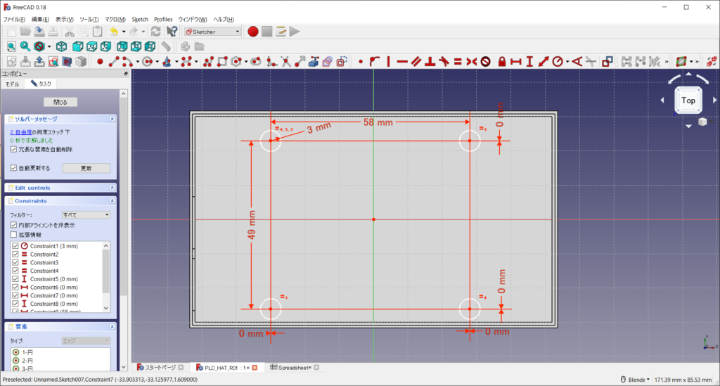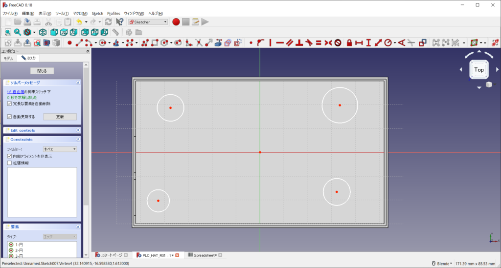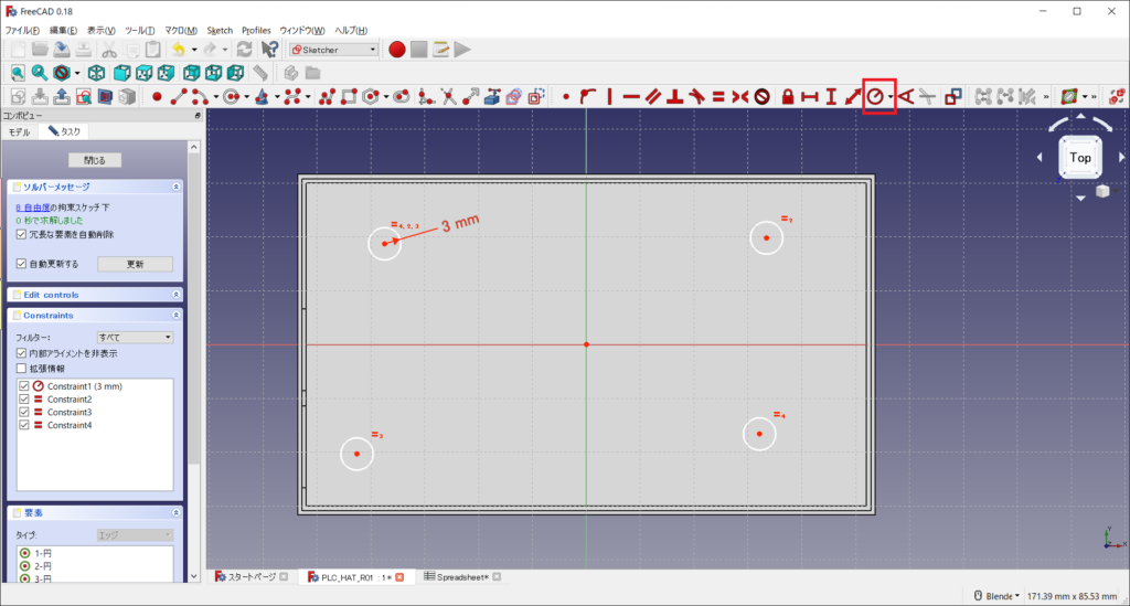 サークル4個を全て選択した状態で、円の半径を3.0mmで拘束する。