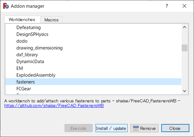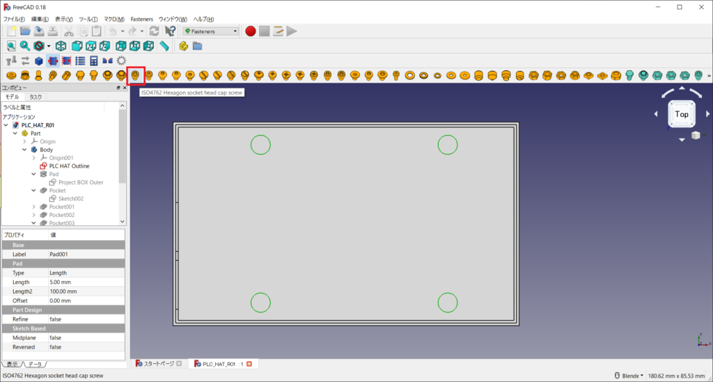 “ツール” -> “Addon manager”から”Fasteners”をインストール。