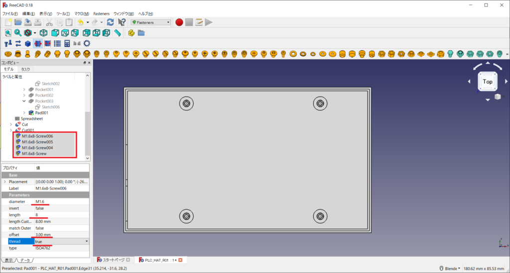 ネジのプロパティでM1.6, Length=8mm, offset=3mmを設定する。